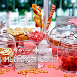 В большинстве случаев изящно сервированный сandy bar заказывается для свадьбы. Кстати, десертный стол вполне может стать хорошей альтернативой традиционному свадебному торту, либо наилучшим образом дополнить его, позволив вашим гостям насладиться сладким угощением. По окончании мероприятия гости могут положить наиболее понравившиеся лакомства в специально приготовленные коробочки, кулечки, корзинки или мешочки и взять их с собой на память о празднике. Десертный стол – это еще один счастливый символ свадебного дня, обещающий молодоженам множество сладких мгновений в супружеской жизни. Подчеркните сладость своих чувств и подарите шоколадно-ванильные мгновения своим гостям!